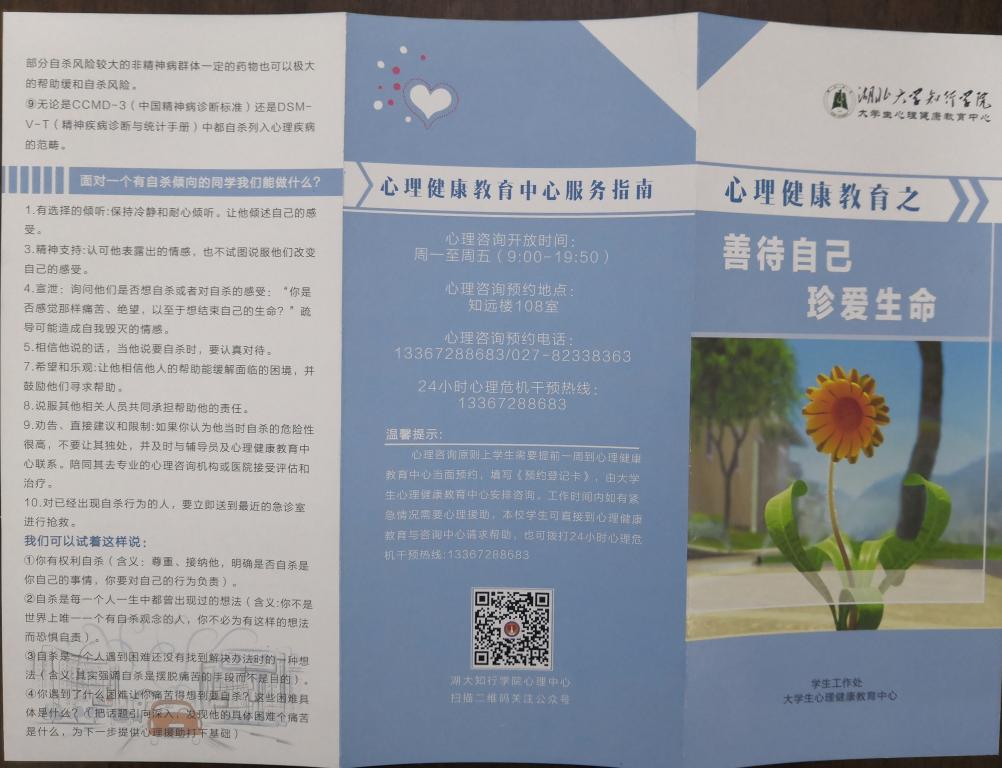 为给在校大学生创造安全稳定的学习生活环境,提高大学生安全意识,实现其心灵成长,维护安全稳定,湖北大学知行学院校心理健康教育中心特于2019年3月20日-4月15日举办主题为“珍爱生命--远离心理危机”的系列活动。举办“爱你在心口难开”生命安全教育知识展,分发“善待自己,珍爱生命”安全教育手册,以及组织两场大学生心理安全教育讲座。