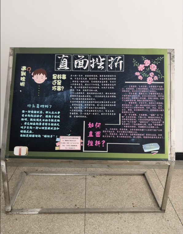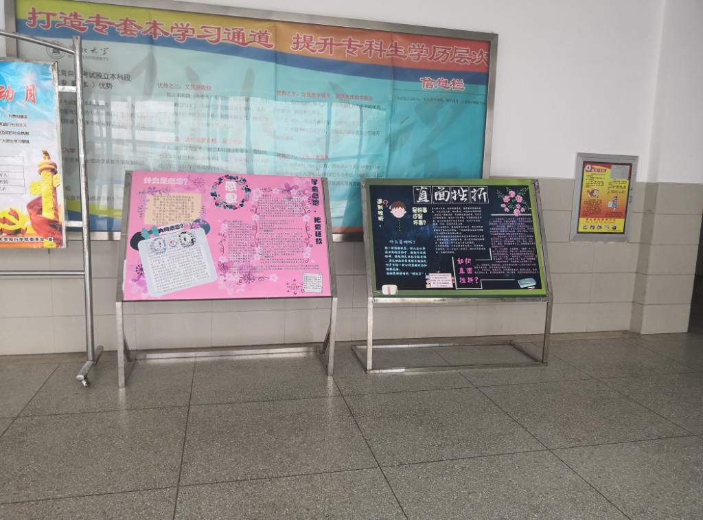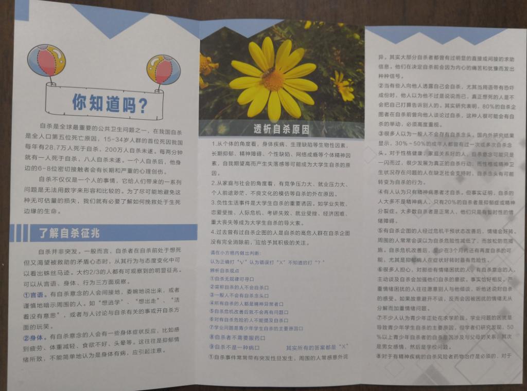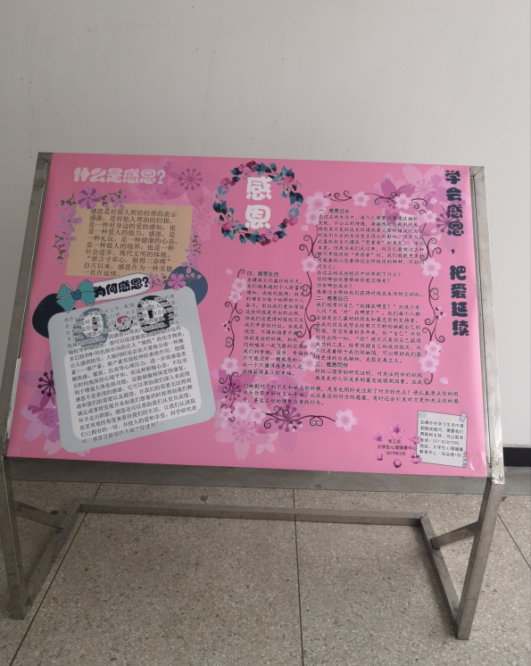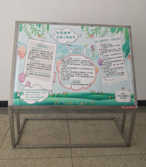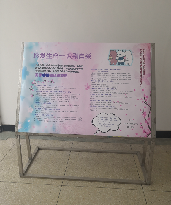 于2019年3月20日-4月15日,我校心理健康教育中心将主题为“珍爱生命--识别自杀”、“珍爱生命--远离心理危机”、“直面挫折--阳光总在风雨后”及“爱,从感恩开始”的知识展板在知远楼和四号教学楼展出。