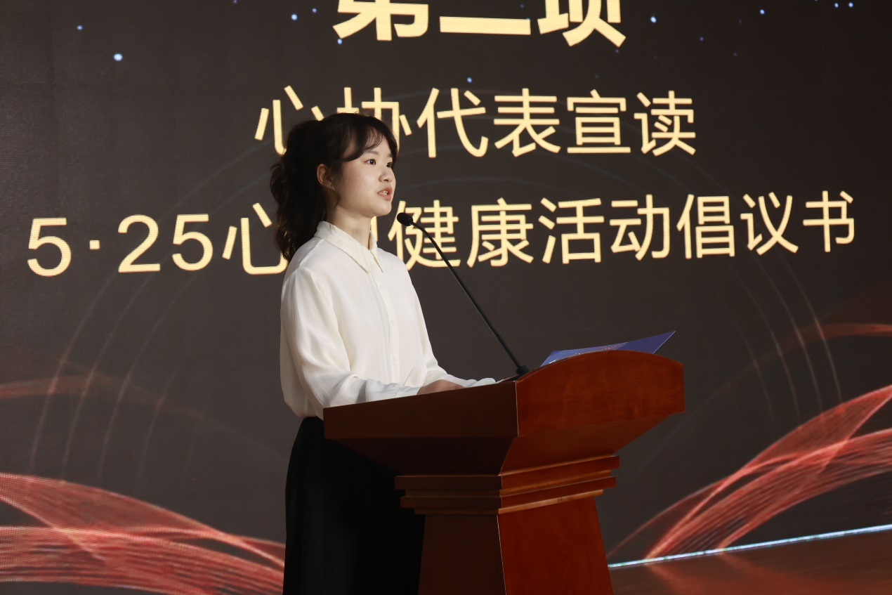 活动第二项是大学生心理健康协会代表宣读心理健康日倡议书。倡议书中介绍了5月25大学生心理健康日,提倡了接纳自己,热爱自己,爱家人、爱社会、爱生活的观点。倡议书中主要提到“给心灵多一些体验”、“给情绪多一份关注”、“给自己多一点勇气”、“给自己多一声喝彩”四个方面,展示了现代青年人心理面对的主要问题并对症下药地提出了解决方案。是对青年人面对心理问题的有效帮助。