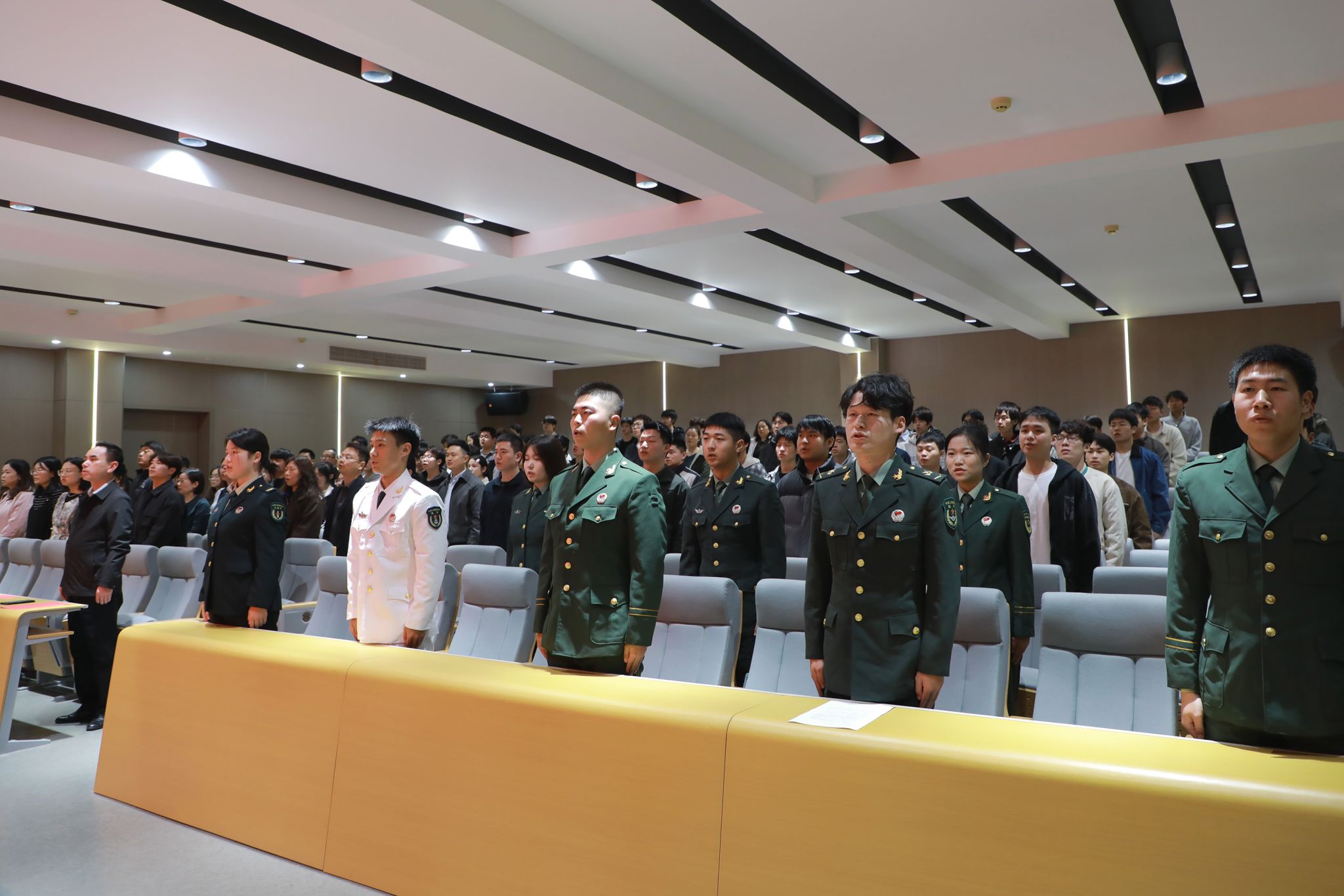 据了解,这59名成员全部是学校在读的退役大学生士兵,他们中有人曾在边防哨所战风斗雪,有人曾在抢险一线冲锋陷阵,有人曾获评“四有”优秀士兵。如今重返校园,他们脱下军装、拿起书本,却依然保持着军人的作风与担当。“我们将继续发扬部队优良传统,在学校国防教育、校园安全、志愿服务中当好排头兵。”“知行青锋连”首任连长陈含宇代表全体队员表态,并带领大家举起右拳庄严宣誓。铿锵誓言回荡在报告厅内,赢得阵阵掌声。