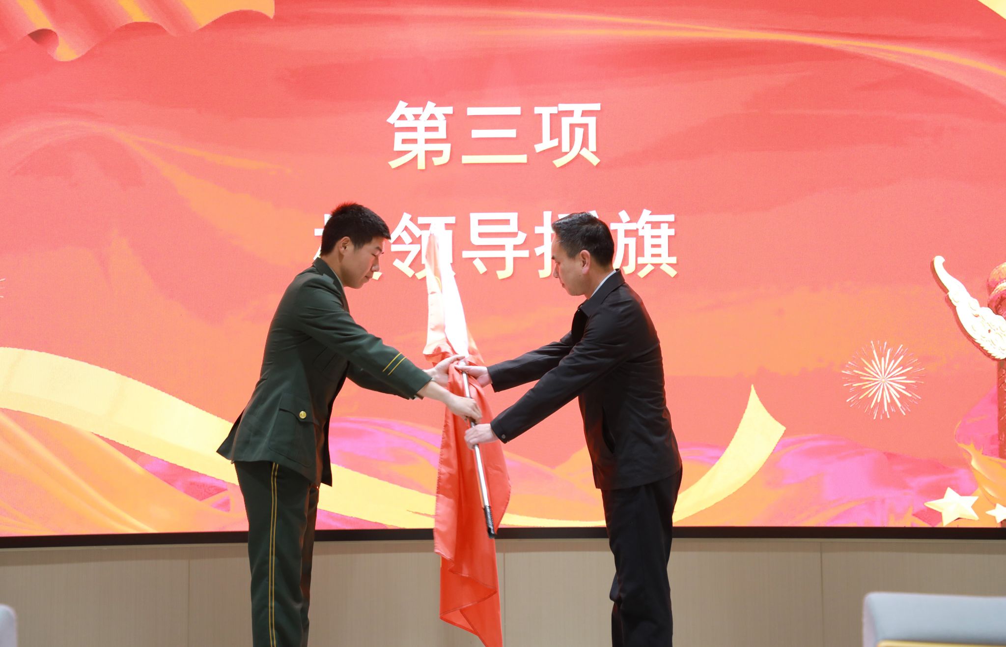 成立大会在庄严的国歌声中拉开序幕。副院长刘张虎为“知行青锋连”授旗。接过旗帜的学生代表漆家乐用力挥动连旗,台下59名身着军装或作训服的队员目光坚定。这支队伍的名字别具深意——“青锋”既寓意青年先锋,又象征锐利锋芒。